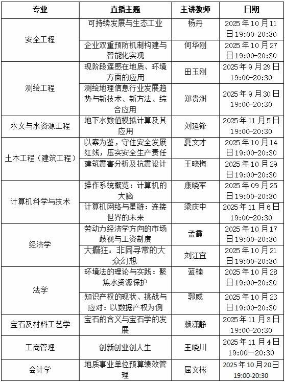 根据2025年秋季学期教学进度,各专业综合性直播教学安排已确定,请各位同学按时参加学习。