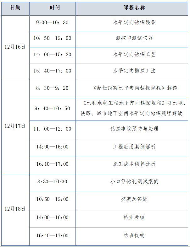 本期培训共 3 天,计 24 学时。采用室内授课与仪器展示相结合的研修方式。主要内容为:相关行业水平定向钻探与测试规程标准、定向钻探装备与测试仪器、定向钻探工艺和施工工法、工程应用实践案例、施工成本概预算等。