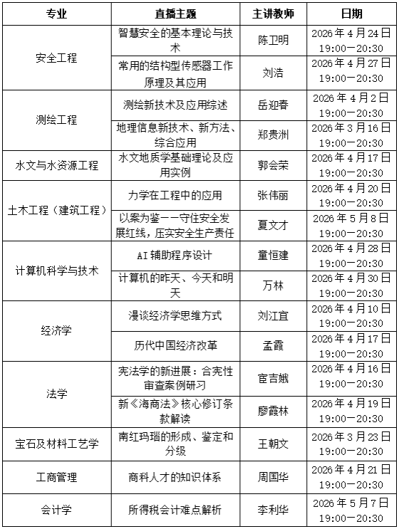 根据2026年春季学期教学进度,各专业综合性直播教学安排如下: