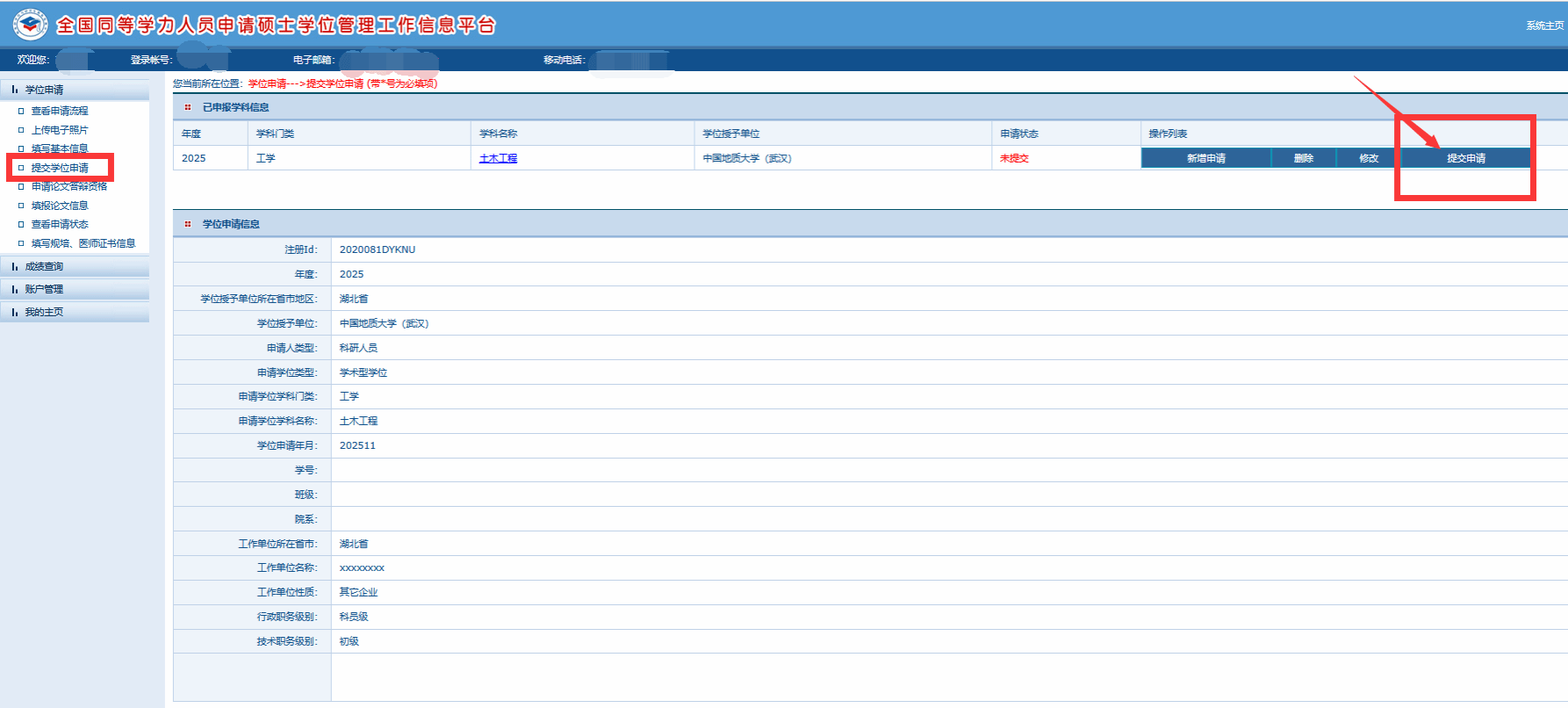 二.进入平台系统,提交学位申请