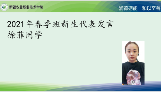 典礼上,新生学生代表徐菲同学做了精彩发言。她对新疆学习中心老师以学生为中心,牺牲自己休息时间举办此次线上开班典礼和导学活动表示感谢。她表示,随着社会的快速发展和工作、生活节奏的加快,知识淘汰的周期也越来越短,人们一次性学习的时代已经过去了,终身教育,终身学习已是一种必然。这对同学们的能力提出了更高的要求,不仅要掌握专业技能,而且要掌握网络技术,所以必须调整自己的知识结构,培养自己的创造能力,获取更多的知识和信息,适应社会经济发展的要求,把在学校学到的知识运用到实际工作中去,在各自的岗位上施展才华,谱写壮丽的人生篇章。